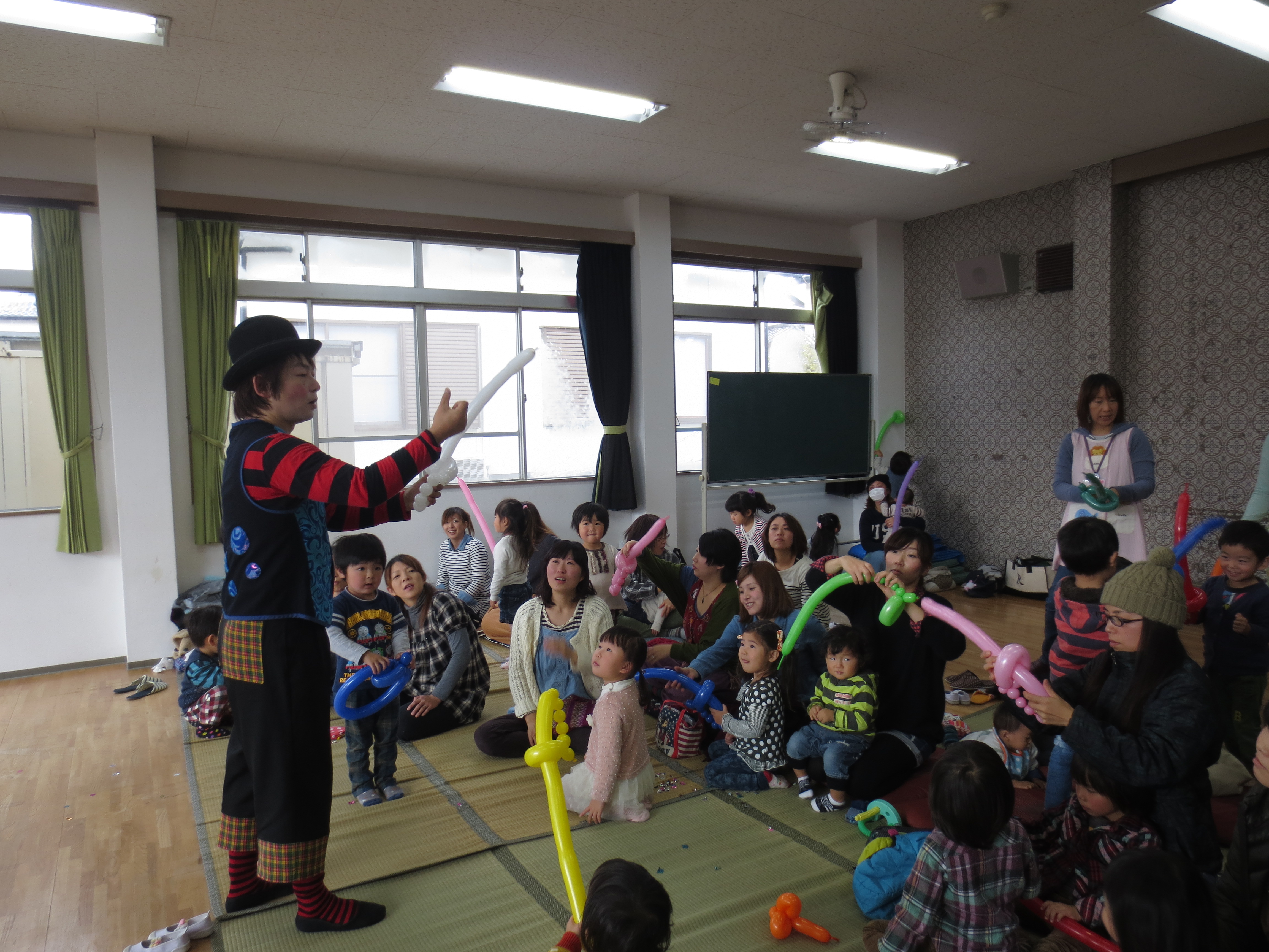 12組の親子が参加しました。子どもたちからは『ねえ。ピエロってどういう人?』との質問が。お楽しみだよとだけ伝え観賞スタート。初めて出会うピエロに目を丸くし、『すごいね~』と大絶賛!ママたちもパフォーマンスを見ては『お~』『すご~い』と見入ってました。マジックバルーンも大変好評でした。滅多に見れないピエロショーを見られて自分(ママ)が興奮した、子どもたちがあんなに至近距離でパフォーマンスを観賞できた事がよかった・感動!!と、とても喜んでおられました。